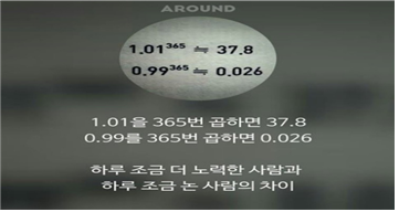 즉, 2%의 차이가 성공과 실패를 좌우하므로, 매일 매일 2%를 더 열심히 살아야 하는 동기를 설명해 주는 법칙이 1.01의 법칙인 것입니다.